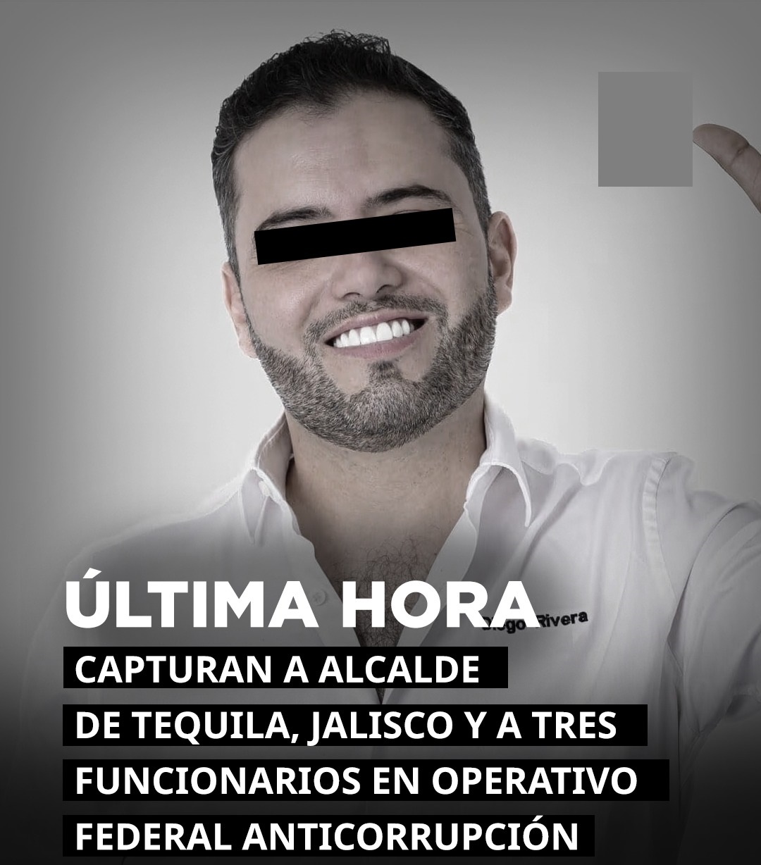 Tequila, Jalisco.— El presidente municipal de Tequila, Diego Rivera Navarro, fue detenido la mañana de este jueves por autoridades federales, señalado por su presunta participación en actos de extorsión y corrupción, informó el titular de la Secretaría de Seguridad y Protección Ciudadana (SSPC), Omar García Harfuch.