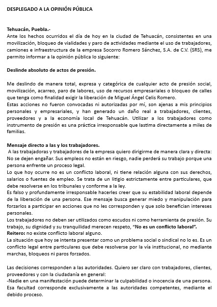 Ante los hechos ocurridos el día de hoy en la ciudad de Tehuacán, consistentes en una movilización, bloqueo de vialidades y paro de actividades mediante el uso de trabajadores, camiones e infraestructura de la empresa Socorro Romero Sánchez, S.A. de C.V. (SRS), me permito informar a la opinión pública lo siguiente: