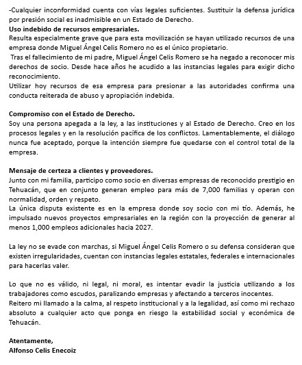 Me deslindo de manera total, expresa y categórica de cualquier acto de presión social, movilización, acarreo, paro de labores, uso de recursos empresariales o bloqueo de calles que tenga como finalidad exigir la liberación de Miguel Ángel Celis Romero.