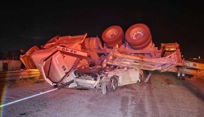 De acuerdo con los primeros reportes, un tractocamión con doble caja volcó, provocando que una de las unidades impactara a un automóvil particular. El percance ocurrió en el tramo con dirección a Sanctorum y la caseta de cobro, lo que derivó en el cierre total de la circulación.